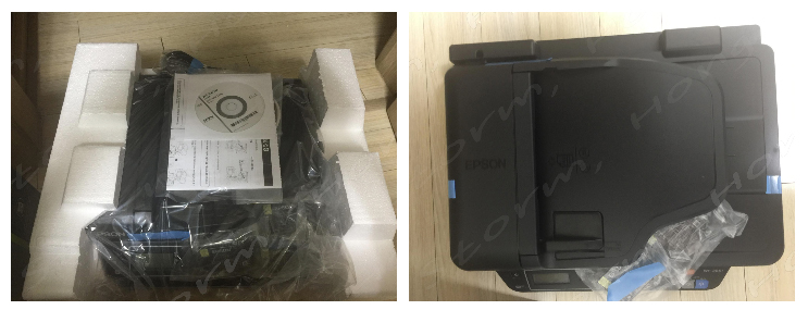 ↑ 왼쪽 사진은 박스에서 바로 스티로폼과 제품을 꺼낸 사진입니다. 바닥 면에는 제품 설치 CD가 들어 있습니다. 프린터를 인터넷을 통하지 않아도 PC에서 사용을 할 수 있도록 바닥에 들어 있습니다. 오른쪽 사진 프린터 윗면에서 용지 팩스나 용지를 넣을 수 있는 공간입니다.