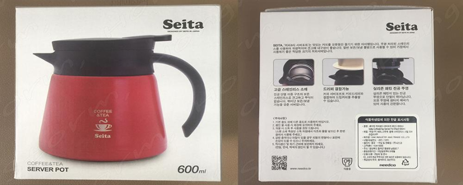 제품 상품 텍이 같이 있습니다. 바코드와 함께, 영어로 Coffee & Tea Server Pot, 스테인리스 소재, 뛰어난 보냉 / 기능, 커피 드리퍼 결합 가능, 실리콘 패킹 진공 뚜껑이라는 글씨가 적혀있습니다. '윤스테이' 에 등장한 Seita와 커피 로고를 통해서 이 제품이 어떤 제품인지 알 수 있었습니다. 그리고 색상의 조합이 모두 검은색으로 있을 때 보다 검은색 + 빨간색으로 되어 있어 조금 더 색다른 느낌을 줄 수 있습니다. 주변에 검은색 제품이 많은 사용자는 한 번쯤 검은색 + 빨간색의 조합으로 포인트를 주는 것도 나쁘지 않습니다.