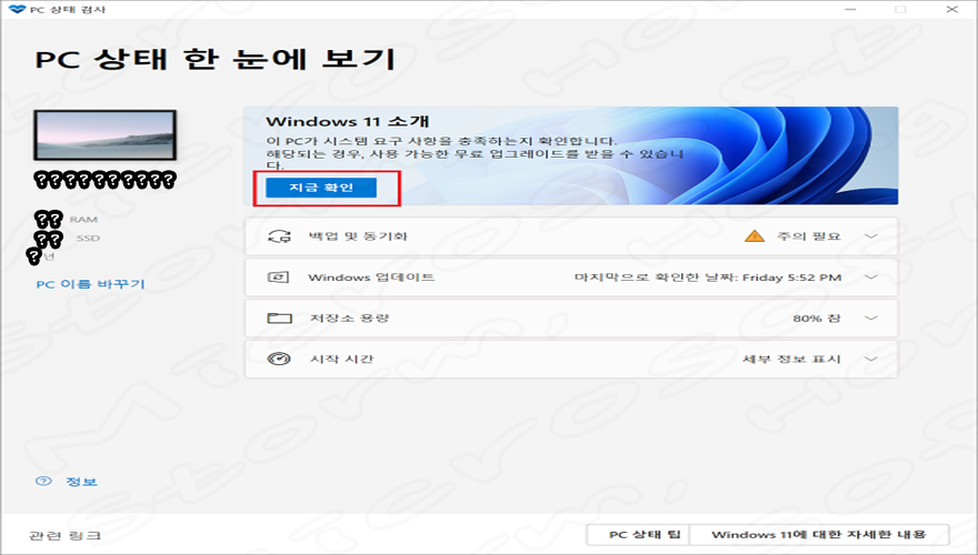 10. 설치가 가능할 경우↓아래와 같은 화면이 나타납니다. (? 표시는 PC 이름과 사양을 나타내며, 다를 수 있습니다.)