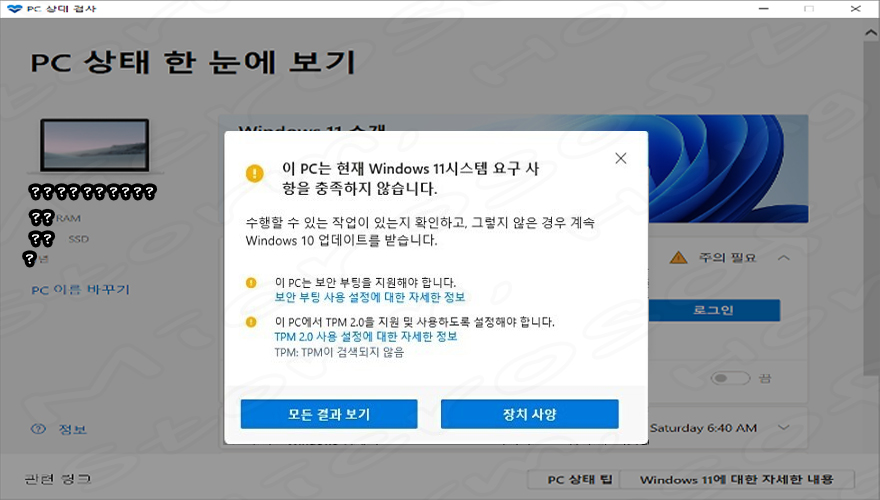 ↑ 위 사진과 같이 나타날 경우 느낌표 표시가 되어 있는 부분을 해결하면 설치가 가능합니다. 대부분 이 경우 BIOS에서 TPM 2.0이 활성화되지 않은 경우입니다. 각 제조사별 활성화 방법을 확인하여 켜주고 재부팅을 실시하고 재부팅을 해줍니다.