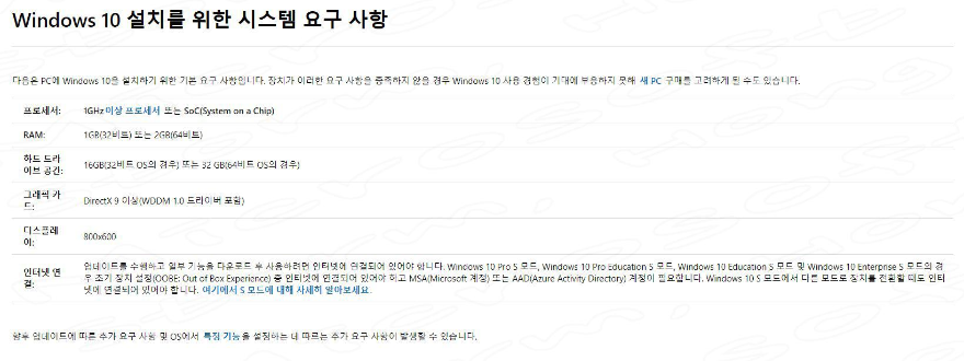 그 Windows 10 (윈도우 10) 업데이트를 위한 시스템 사양은 다음 사양을 충족해야 설치가 가능합니다.
