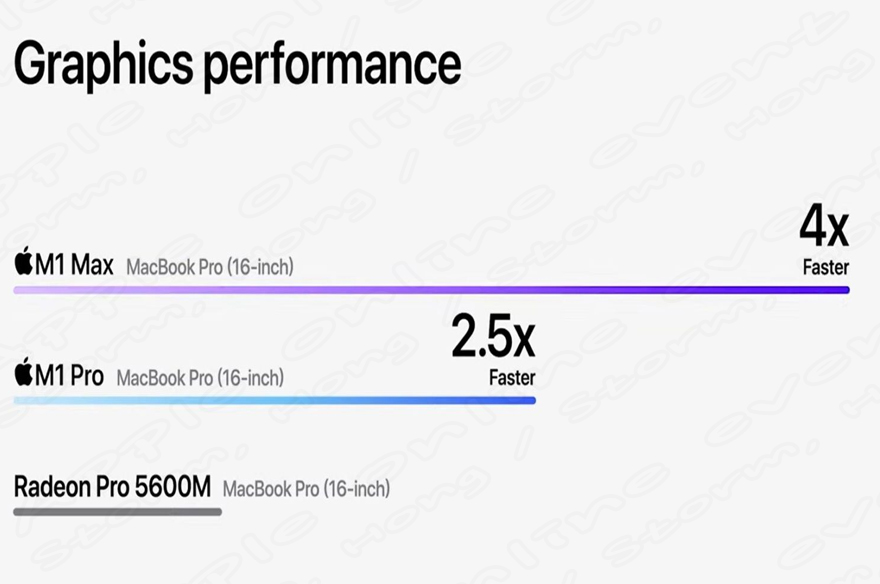 M1 Pro 70% 더 적은 전력 소비로 NVIDIA GeForcee RTX 3050 Ti (Lenovo Legion 5 82JW00012US) 와 경쟁할 것으로 보이며 그보다 빠른 2배의 성능을 보여 준다고 알려졌습니다. M1 Max는 100W 더 적은 전력으로 실행되면서 NVIDIA GeForce RTX 3080 및 NVIDIA GeForce RTX 3070 (MSI GE76 RTaider 11UH-053)과 같은 고성능 노트북 그래픽과 동일한 성능을 낼 것으로 알려졌습니다. 이는 그래픽 성능이 Cinema 4D S25 및 Redshfit v3.0.54와 같은 앱 내에서 측정된 것이라는 이야기가 나왔습니다.