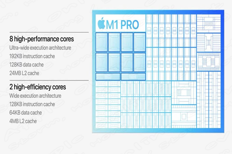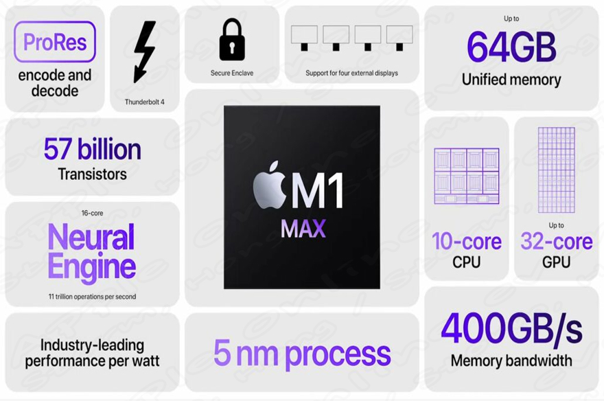 M1 Pro 와 M1 Max는 10 코어 구성으로 된 완전히 새로운 칩이며 이중 8개의 고성능 코어는 초광대역 실행 아키텍처를 기반으로 하고 있으며, 2개의 고성능 코어는 광역 실행을 기반으로 하는 것으로 알려졌습니다. 이를 통해 5nm SOC를 통해 각각 32 코어 및 16 코어의 GPU를 갖추고 있다고 합니다. 또한 M1 Pro는 최대 337억 개의 트랜지스터가 있으며, M1 Max에는 570억 개의 트랜지스터가 위치하고 있다고 밝혔습니다.