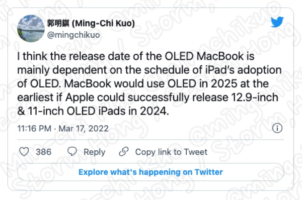 TF International Securities 의 Ming-Chi Kuo 에 의하면 OLE iPad 모델의 첫 번째 제품군은 2024년에 출시될 것으로 예상, 예측, 루머, 소문으로 알려지고 있다는 정보를 전했습니다. 이에 OLED MacBook 출시는 전체적으로 iPad 모델을 얼마나 빨리 출시할 수 있을지에 따라 다라질 것으로 보인다는 예상, 예측, 루머, 소문의 정보를 전했습니다.