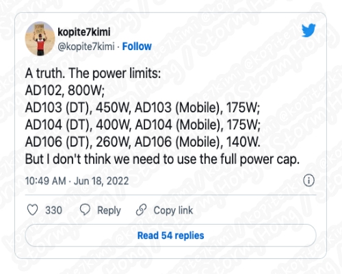 동일한 누출자의 이전 분석에서 NVIDIA AD103 Mobile SKU의 최대 전력 제한은 175W이며 AD104 SKU에도 유지되며 AD106 GPU의 전력 제한은 140W이고 AD107은 종료됩니다. 100W 범위 또는 그 이하의 어딘가에 있습니다. GeForce RTX 40 시리즈 그래픽 카드는 2022년 4분기에 출시될 예정이며 이동성 GPU는 CES 2023 주변에 출시될 예정입니다.