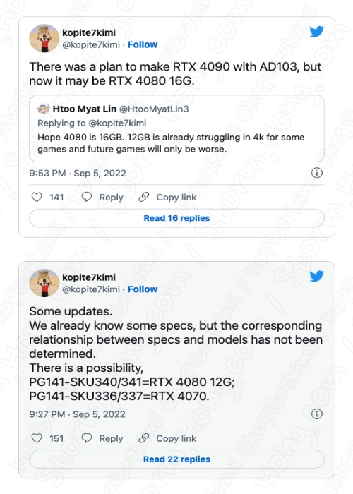 Kopite7kimi 에 따르면 NVIDIA GeForce RTX 4080 12 GB 는 PG141-SKU340/341 PCB를 얻을 것이라고 예상, 예측, 루머, 소문의 정보를 전했습니다. 이는 AD104 GPU 코어를 메인으로 사용할 것으로 보이며, 12GB 및 16GB 모델을 생산한다고 한다면, AD104 및 AD103 GPU 에서 동일한 PCB 및 핀 호환이 가능하고, 12GB 및 16GB 모델 모두 12GB 변형이 192 비트로 약간 축소된 AD103 다이를 사용하게 될 수 있다는 예상, 예측, 루머, 소문의 정보가 나오고 있는 만큼 지켜봐야 할 것으로 보입니다.