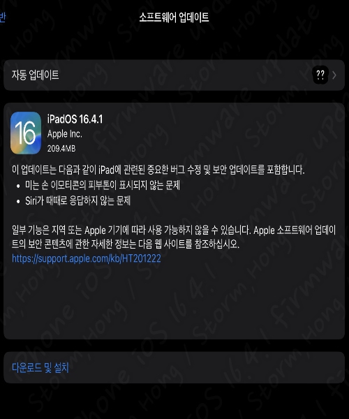 iPadOS 16.4.1 설치 공간은 약 209.4 MB 입니다. (설치용량은 각 이전에 업데이트하지 않으신분들은 더큰 용량일수있습니다.)이전의 iPadOS 16.3 이하 업데이트를 하지 않으신 분들은 한꺼번에 설치해야 하므로 용량이 클 수 있습니다.