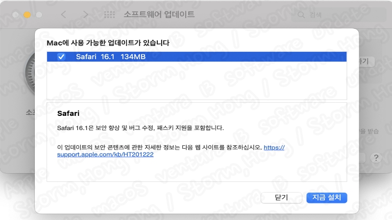 기존 업데이트에서 새롭게 업데이트된 버전 Safari 16.1 로 macOS Ventura 13 업데이트 없이 추가 사항을 누르면, 업데이트가 가능합니다. 용량은 134 MB 이며, 주요 내용은 버그 수정, 패스키 지원을 포함합니다. 이를 통해 향상된 보안 및 기능이 가능하며, iOS 16.1 , iPadOS 16.1 업데이트에서 향상된 Safari 와 연동될 수 있도록 업데이트되는 기능도 추가되었습니다.