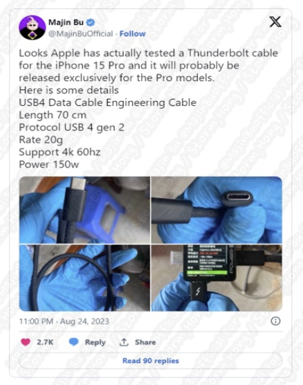 ↑ An engineering version of the Thunderbolt cable said to release for the iPhone 15 Pro and iPhone 15 Pro Max / Image Credits - Majin Bu
