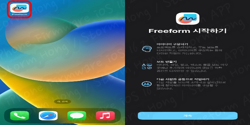 1. ↓ 아래와 같이 Freeform 앱을 선택하면 다음과 같이 나타납니다. 이후 계속을 눌러 줍니다.