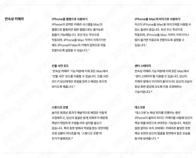 Mac 에서 iPhone (아이폰) 의 카메라를 연결하여 사용할 수 있는 기능입니다. 이 기능은 iPhone (아이폰) 카메라가 MacBook 또는 Studio Display 보다 좋기 때문에 연동하여 사용하는 방법입니다. 이때 iPhone (아이폰) 카메라, 기능인 사진 효과를 눌러 비디오 효과 , 센터 스테이지 기능, 인물사진 모드, 스튜디오 조명 효과 등을 활용하여, 통화 시 좀 더 유용하게 사용할 수 있습니다. 단 이러한 기능은 아이폰 XR 이후 모델에서 사용이 가능합니다.
