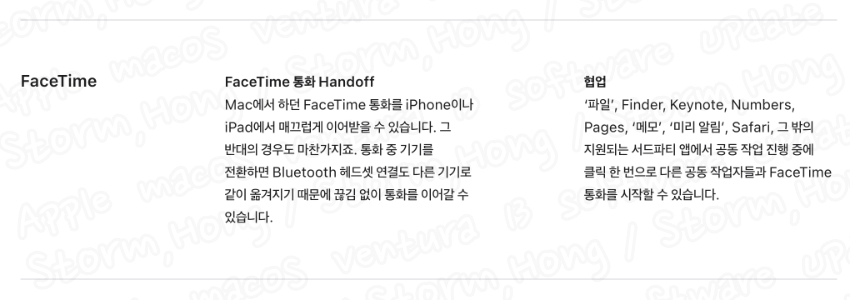 새롭게 추가된 FaceTime Handoff 기능을 지원할 수 있도록 macOS Ventura 13에서 업데이트가 되었습니다. 외부에서 아이폰을 가지고, 페이스 타임을 이용하고 있을 때, mac 제품 가까이에 가져가면, mac 으로 페이스 타임이 전환됩니다. 이를 통해 좀 더 큰 화면에서 사용이 가능합니다. 그리고 다시 통화 중 이동 시에 외부에서도 Face Time 을 사용할 수 있습니다. 이를 통해 연속성 있는 페이스 타임 사용이 가능합니다.