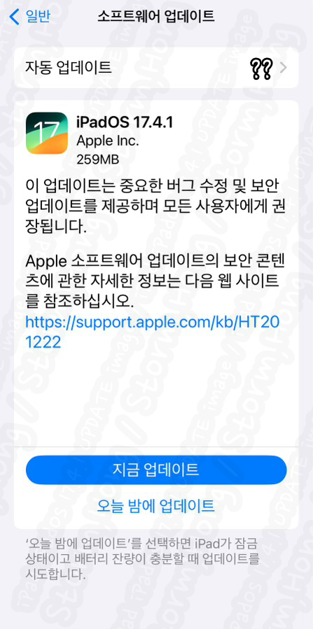 * iPadOS 17.4.1 은 iPadOS 17.4, iPadOS 17.3.1, iPadOS 17.3,iPadOS 17.2, iPadOS 17.1.2,iPadOS 17.1.1, iPadOS 17.1, iPadOS 17.0.3, iPadOS 17.0.2, iPadOS 17.0.1, iPadOS 17, iPadOS 16.7.2 및 16 업데이트 이후 아래와 같이 iPadOS 17 업데이트 메시지가 나타나는 제품에서 업데이트가 가능합니다.