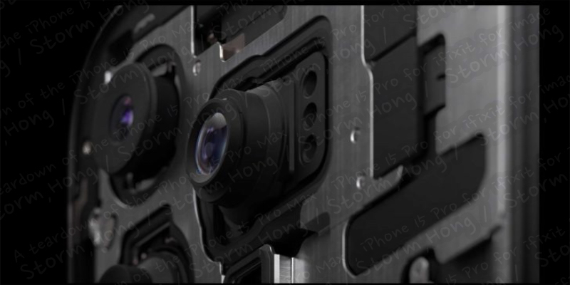 ↑ A teardown of the iPhone 15 Pro Max by iFixit, showing the rear camera module